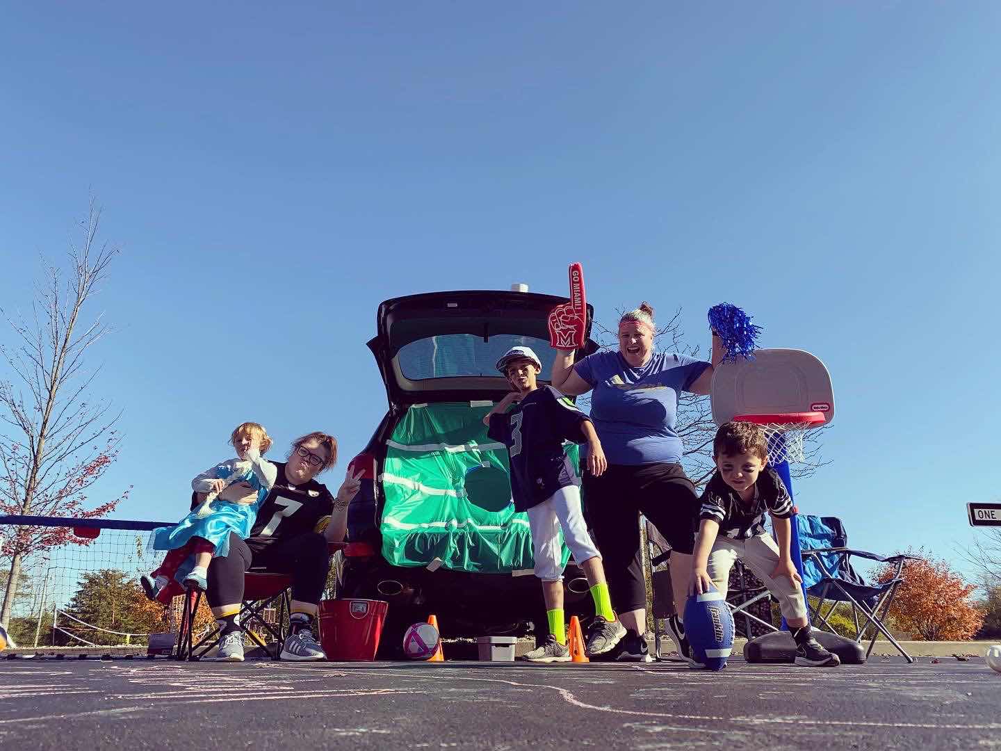 1. Sportsball for All our trunk at Trunk or Treat. We had such fun with this theme and the kids. thea is wearing her elsa costume refusing all other options. Jones peyton manning and Garrett some other football player. Lita and I fans.