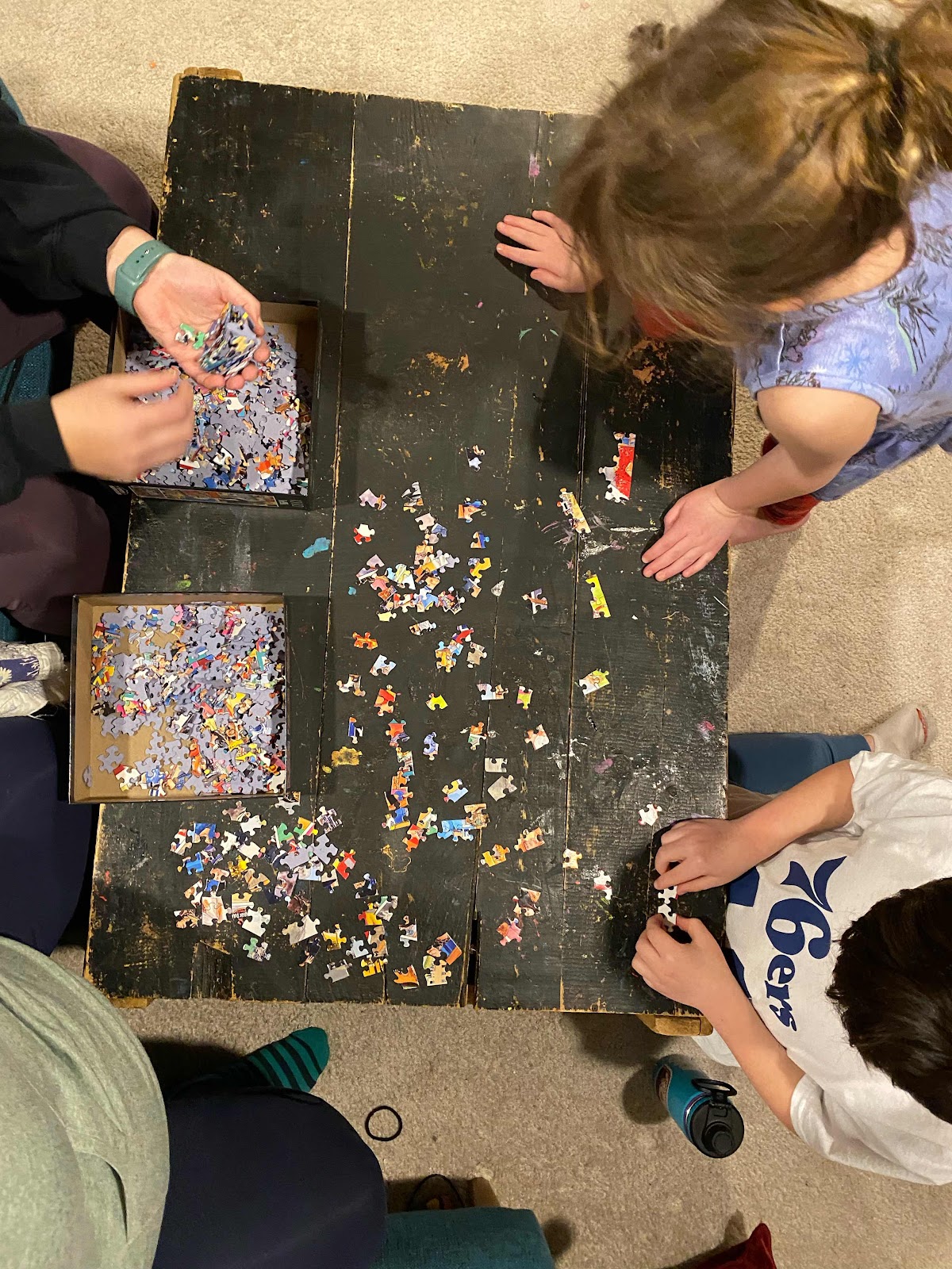 I bought this puzzle back in December with hopes of doing it this winter. While Kathleen visited we knocked it out. It took about 4.5 hours. The kids attempted to help but they really just connected a handful of pieces. When we finished it we discovered 6 pieces weren’t even in the box. I am pretty sure we didn’t lose them since we moved the table and looked under the couch etc. oh well!