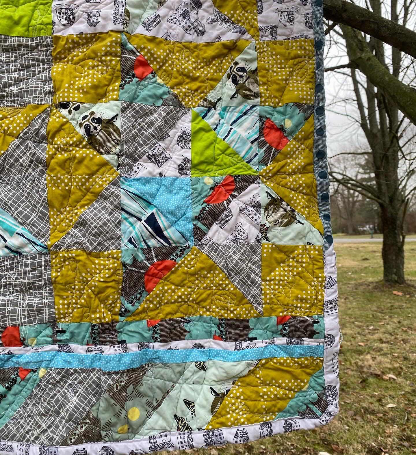 I finished this in Jan. Used a bunch of stash fabric. And did a random half square triangle pattern. I love these charley Harper prints.